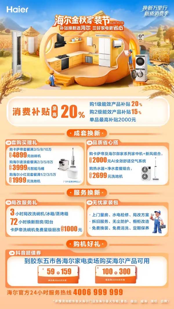 大众网记者 李潇 青岛报道 随着金秋家装旺季的到来,海尔智家胶东区域,启动“胶东海尔金秋家装节”主题活动。本次活动深度契合用户秋季家装、家电换新的需求,旨在通过“好产品、好服务、好质量”的“三好”核心价值提供省心解决方案,更重磅加码 “十天十夜,海尔宠粉足球盛宴”,为青岛、烟台、威海、潍坊、日照五市的消费者带来一站式的省心智慧生活解决方案。 好产品,定义智慧生活新标准。活动期间,海尔智家携旗下海尔、卡萨帝、统帅(leader)等全系列产品矩阵亮相。从满足高端生活方式的卡萨帝鉴赏家系列,到专为年轻消费者设计的海尔麦浪、小红花套系、leader三筒懒人洗衣机等爆款产品,海尔以全球领先的科技实力,确保每一款产品都是品质之选。无论是实现细胞级保鲜的冰箱、实现空气管理的空调,还是提供洁净洗护的洗衣机,海尔好产品都是提升家居品质的可靠保障。 好服务,重塑家电消费新体验。家电购买仅是开始,服务才是关键。海尔首创“无忧家装包”服务,涵盖上门量房、水电检修、局改方案、拆旧服务、无尘防护等九大环节,彻底解决用户在家装过程中与家电安装的衔接难题。针对局改需求,更推出 “3小时极速局改” 及 “72小时厨房/阳台焕新”等限时服务,最大化节约用户时间成本。 好质量,承诺恒久安心之选。海尔始终将品质质量视为生命线。本次活动主推的1、2级能效产品,不仅享受高额补贴,更是海尔对绿色、节能、可持续生活方式的践行。其背后是海尔对原材料、生产工艺、出厂检测的严苛把控,确保用户买得放心,用得安心。 海尔智家胶东区域相关负责人表示:“我们希望通过此次金秋家装节,将‘三好’理念传递给每一位用户。选择海尔,不仅是选择一件家电,更是选择一种省心、可靠、高品质的生活方式。” 特别惊喜:引爆双节的足球狂欢 为打造极致用户体验,本次家装节特设足球盛宴环节。9月28日至10月7日期间,用户购买海尔套餐满1万元,即可参与连续10天的小程序抽奖,赢取冠军球衣等粉丝好礼;购机满5万元,更可参与抽取 “欧洲观赛游” 终极豪礼,亲临利物浦或巴黎圣日耳曼主场,感受世界顶级足球赛事的激情。 据悉,本次家装节补贴力度空前,详情请咨询胶东五市(青岛、烟台、威海、潍坊、日照)各海尔家电卖场及专柜。 |