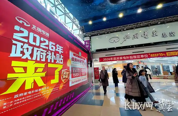 2026年1月1日,河北全面启动消费品以旧换新活动。长城网·冀云客户端记者 烟成群 摄 长城网·冀云客户端讯(记者 烟成群)2026年元旦假期,河北省各地紧抓节日消费旺季,密集推出多元促消费举措,开展形式多样促消费活动,进一步挖掘消费潜力,激发消费热情,扩大消费规模。据商务部统一业务监测平台显示,1-2日,全省重点监测的138家餐饮样本企业实现营业额1358万元,同比增长16.09%。 消费需求稳步释放 激活节日消费潜力 元旦期间,全省消费市场需求进一步释放。唐山14家重点商贸企业客流量达77.3万人次,同比增长12.1%;实现销售额9745.9万元,同比增长7.4%。邢台14家大型商超单日客流量达33.1万人次,同比增长6.5%;实现销售额1360.7万元,同比增长5.2%。石家庄鹿泉区北国奥特莱斯客流量同比增长8%;实现销售额1547.4万元,同比增长20%。秦皇岛8家大型商超日均客流量30万人次,较节前提高3倍以上;实现销售额2500万元,同比增长15%。邯郸73家重点监测宾馆、酒店入住率达68.9%,实现营业额438万元,同比增长4.3%;52家重点监测餐饮企业实现营业额267万元,同比增长5.2%。 以旧换新政策发力 消费市场提质扩容 2026年1月1日,河北全面启动消费品以旧换新活动,覆盖汽车、家电、数码和智能产品等重点领域,通过政策补贴、企业联动等举措,有效激发消费需求,拉动节日市场消费。