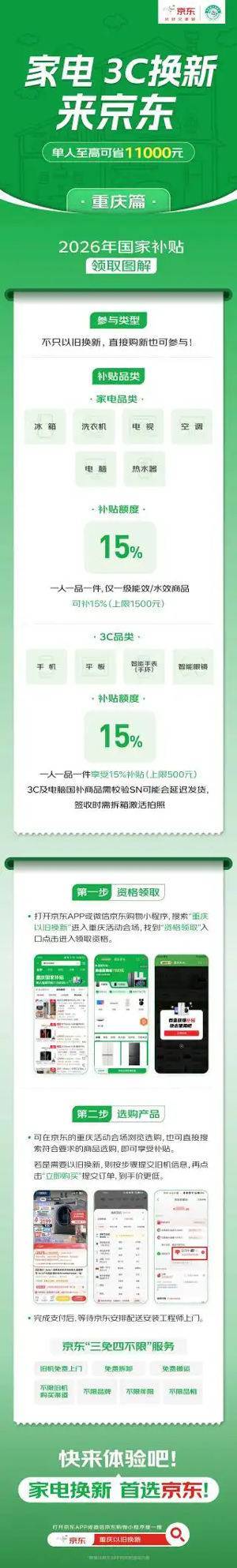 2026年国家以旧换新补贴落地重庆,1月9日重庆国补正式上线京东。重庆消费者到京东APP搜索“重庆以旧换新”即可进入国补页面,领取国补资格。上京东,消费者购买活动指定的冰箱、洗衣机、电视、空调、电脑、热水器产品,单件/单次至高补贴1500元;购买活动指定的手机、平板、智能手表手环、智能眼镜产品,单件/单次至高补贴500元。单人累计至高可省11000元!此外,京东也带来海量爆款好物:1月1日起,上京东领国补叠加以旧换新等,买手机、电脑、家电等好物更省钱。