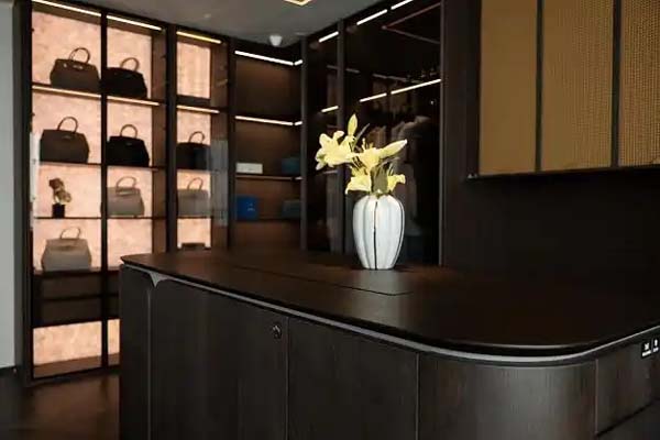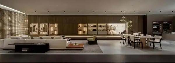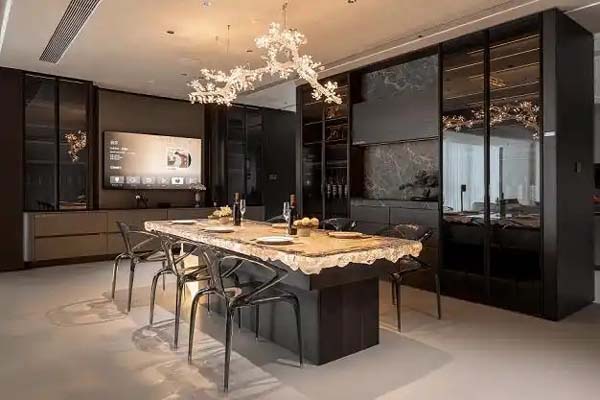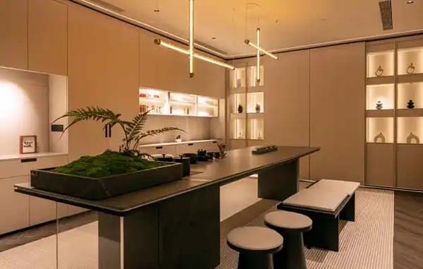 餐厅,轻轻一按,电视隐于无形;茶室,智能茶台,在从“品茶”到“品空间”的沉浸, 感受隔空传茶的“黑科技”;衣帽间,升降智能岛台,优雅收纳新境界,实现从“收纳”到“造型管家”的进化。