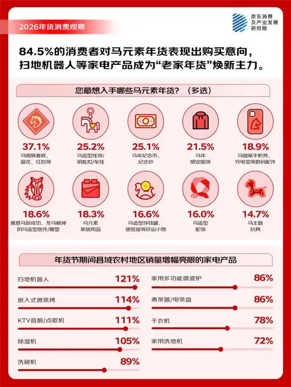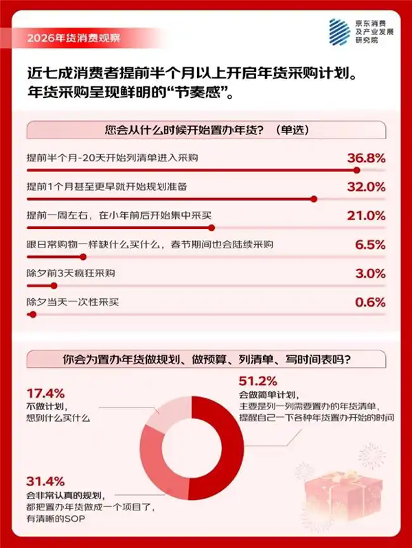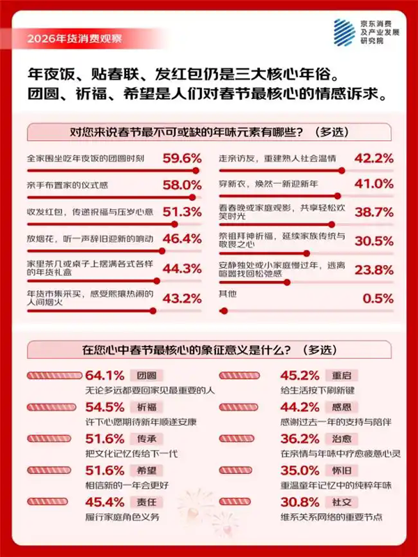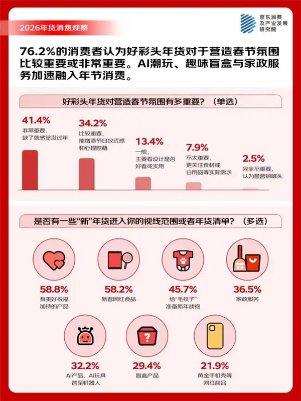 | 退休的李阿姨购物车里堆满了坚果礼盒、糕点礼盒;80后的小晨选购了寓意“马上有福”的生肖挂饰,并给老家添置了智能电器;一位年轻的95后母亲则为孩子精心挑选了红色“新年战袍”……腊八过后,年货市场也正式迎来消费高峰。京东数据显示,1月25日年货节启动以来,年货相关的搜索量同比增长超4倍,红色服饰、马元素摆件、福字装饰及各类礼盒类产品在年货节首周备受青睐。 今年的年货置办有哪些新的想法和需求?年货置办的节奏是怎样的?有哪些“新年货”会出现?日前,京东消费及产业发展研究院邀请了5000名消费者一起聊了聊“置办年货的那些事儿”,总结了如下的观察: · 不同于日常购物,消费者在年货采购过程中展现出“强计划性、高活跃度、礼赠驱动”的显著特征。调研显示,68.8%的用户会提前半个月以上开启年货采购计划,还有21%的人会在小年前后开始集中置办采买年货,高比例的提前采购行为反映出春节筹备承载的“仪式感”。同时,年货消费的计划性更强,超过八成的消费者(82.6%)会在采购前制定购物计划,其中的四成消费者属于“高度计划者”,他们将年货置办视为一个“项目”,做规划、做预算、列清单、定排期……形成清晰的SOP,有节奏的进行细节落地。另一组调研数据则显示,相较于日常购物,超过半数的消费者在选购年货时会显著增加打开购物APP的频率,“看到合适的商品会先放入购物车”、“会比平时更加关注礼盒类产品”。 · 年货采购呈现鲜明的“节奏感”, 近八成(79.4%)的消费者分阶段购置不同类型年货,家用大件/高价值产品、年礼、好意头好彩头用品排期靠前,“先购置家居大件或高价值商品,然后是家庭日用品”、“先购置好意头的用品,后购买休闲食品”、“先选礼盒类商品,后买散装零食”是主流思路。从具体时间节点上看,腊八前后,年货清单上更多的是花样年礼、米面粮油/干货坚果、焕新家电、新年战袍及装备、好彩头的家居饰品等;小年前后,酒水糖果、网红零食、新年战袍、核心食材、大扫除服务跻身前列;除夕前三天,年夜饭食材及生鲜水果进入集中采购期,年宵花/红包/电子鞭炮/氛围灯串等年味儿装饰及糖果礼包成为采购重点。 · 多种“新”年货涌现,好彩头年货、科技新年货和网红食品凭新鲜体验领跑,宠物与服务消费快速崛起。在“新年货”中,“好彩头”年货产品,如“马上有钱”摆件等(58.8%)与新晋网红食品,如奶皮子、黄油年糕等(58.2%)最受青睐,年轻的年货主理人们引导风潮。同时,45.7%的消费者为宠物购置新年服饰,“毛孩子”已正式纳入家庭年节仪式;实用型服务消费显著增长,36.5%的用户选择家政套餐,反映对“省时省力”的强烈需求。以AI产品为代表的智能科技正成为家庭团聚中的新纽带,32.2%的消费者已将AI玩具、家用机器人等纳入年货清单,希望通过这些新奇体验为老人和孩子增添节日乐趣。年货边界正在拓宽,从实物向服务、从人向宠物延伸,从传统向科技,新奇体验为节日增添乐趣,科技成为亲情的温暖载体,消费动机也转向提升生活品质与节日体验的综合追求。 · 马年的吉祥话创作空间丰富、有趣有彩头,“龙马精神”“马上有福”“一马当先”等祝福语加持的马年礼盒备受欢迎。调研显示,84.5%的消费者对马元素年货表现出购买意向,65.6%的消费者表示“有明确计划”或“可能会买”马年主题礼盒,并将其视为一种重要的新年仪式。具体品类上,年俗文创礼盒(23.7%),内含春联、红包、门神等,因其直接服务于春节的核心仪式,成为最受欢迎的选择。紧随其后的是坚果糖果巧克力大礼包(23.8%)和牛奶乳饮礼盒(22.2%),茗茶礼盒(13.3%)和地方特产礼盒(19.2%)。 · 扫地机器人等家电产品成“老家年货”焕新主力。年货消费在县域农村市场呈现不一样的特点。京东数据显示,年货节开始后县域及农村地区的家用电器类产品销量增幅尤为亮眼,折射出新一代“老家年货”的升级趋势。其中,扫地机器人销量环比激增121%,嵌入式微蒸烤一体机增长114%,KTV音响/点歌机增长111%,除湿机、洗碗机、多功能微波炉、煮茶器等产品增幅均超过70%。 55.3%的人从腊八开始感知年味儿,年夜饭、贴春联、发红包仍是三大核心年俗 “人总是在无限接近幸福的时候最幸福。”这是很多网友对于春节心态的总结。确实,春节的仪式感始于一个逐渐酝酿的过程。55.3%的消费者明确表示,腊八节前后是年味的起点,“过了腊八就是年”这一传统观念在调研中得到强化,显示传统民俗依然是唤醒春节消费记忆的关键节点。 在消费者心中最不可或缺的“年味元素”中,“全家围坐吃年夜饭”(59.6%)、“贴春联、福字、窗花”(58.0%)和“收发红包,传递祝福与压岁心意”(51.3%)位居前三。这些年味最浓的场景共同指向春节最核心的情感诉求——“团圆”(64.1%)、“祈福”(54.5%)、“希望”(51.6%)等深层情感需求。 能让人们觉得“这才有过年的感觉”的具体场景,也高度集中在家庭团聚与传统仪式上,如“年夜饭桌上摆满‘柿柿如意’‘年年有鱼’等寓意吉祥的菜肴”(50.6%)、“全家一起看春晚吐槽节目,其乐融融”(49.7%)以及“零点整,窗外烟花照亮夜空”(47.3%)。 为了营造“理想中的春节氛围”,高达60.8%的受访者会选择“提前大扫除,干干净净迎新春”,45.1%“精心选购/制作有年味的装饰品”,另有42.4%会“制定家庭活动计划,游戏、观影
